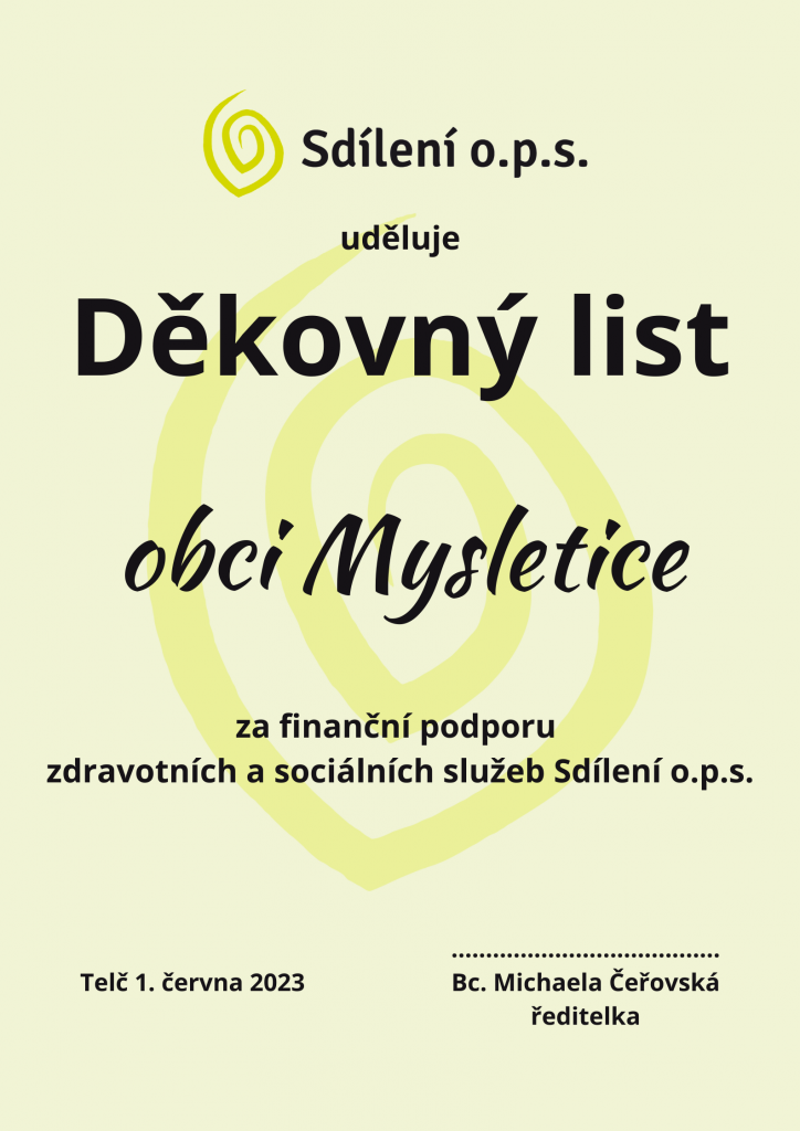 Jménem obce bych chtěla i já poděkovat Sdílení, o. p. s. za jejich profesionální a obětavou práci.